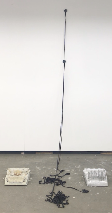 plaster, and one typewriter of aluminium. This typewriter had drops falling up from the keys. The keys and the drops can be interpreted in different ways. When you would use this typewriter, you will hurt your fingers. Besides that, the drops are a reference to the process (lost wax method). At the same time, I ask myself questions about the function of the typewriter, because of this installation. Both typewriters